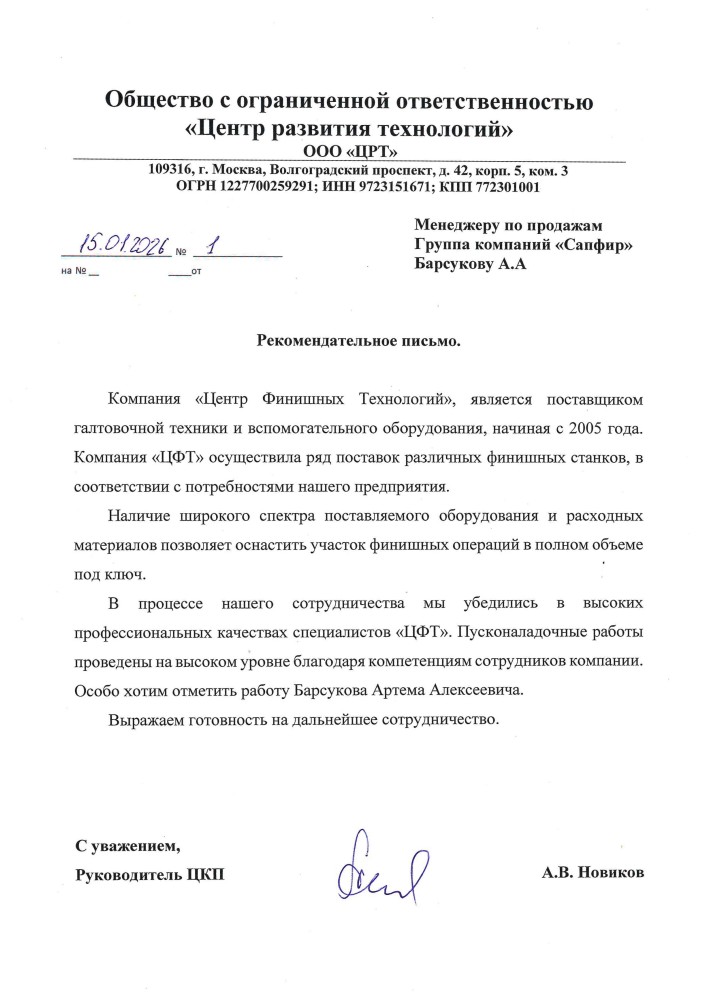 Компания "Центра Финишных Технологий" является поставщиком галтовочной техники и вспомогательного оборудования начиная с 2005 года. Компания "ЦФТ" осуществила ряд поставок различных финишных станков в соответствии с потребностями нашего предприятия.
